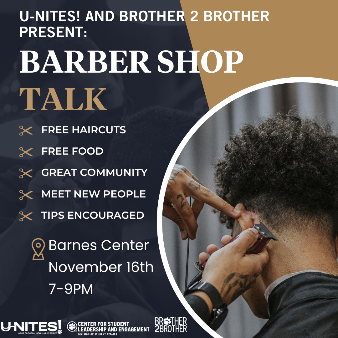 U-NITES! and Brother2Brother (B2B) will host a Barbershop Talk in the Barnes Center on 11/16 from 7 – 9pm. We will have free haircuts, food, and great male-based discussions.